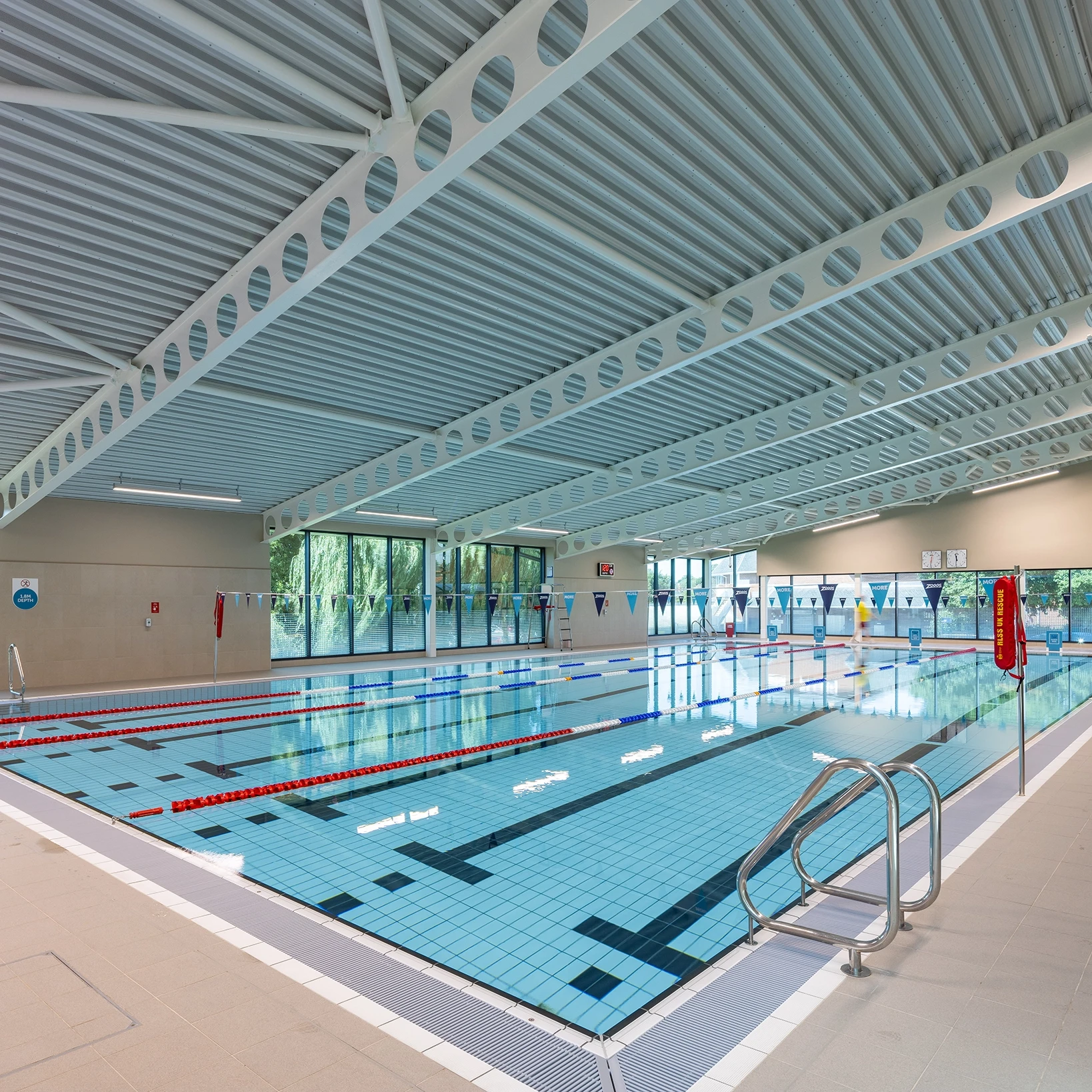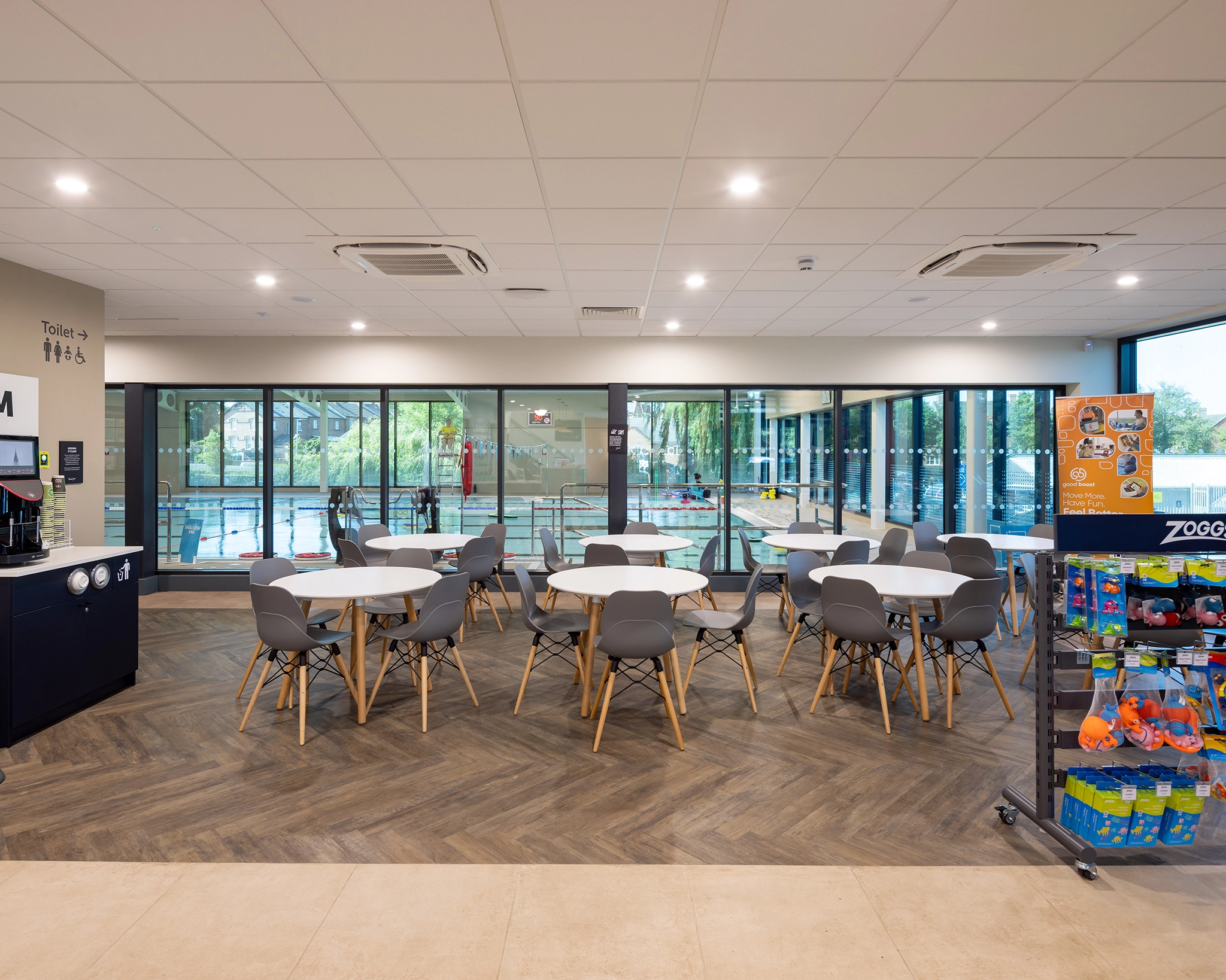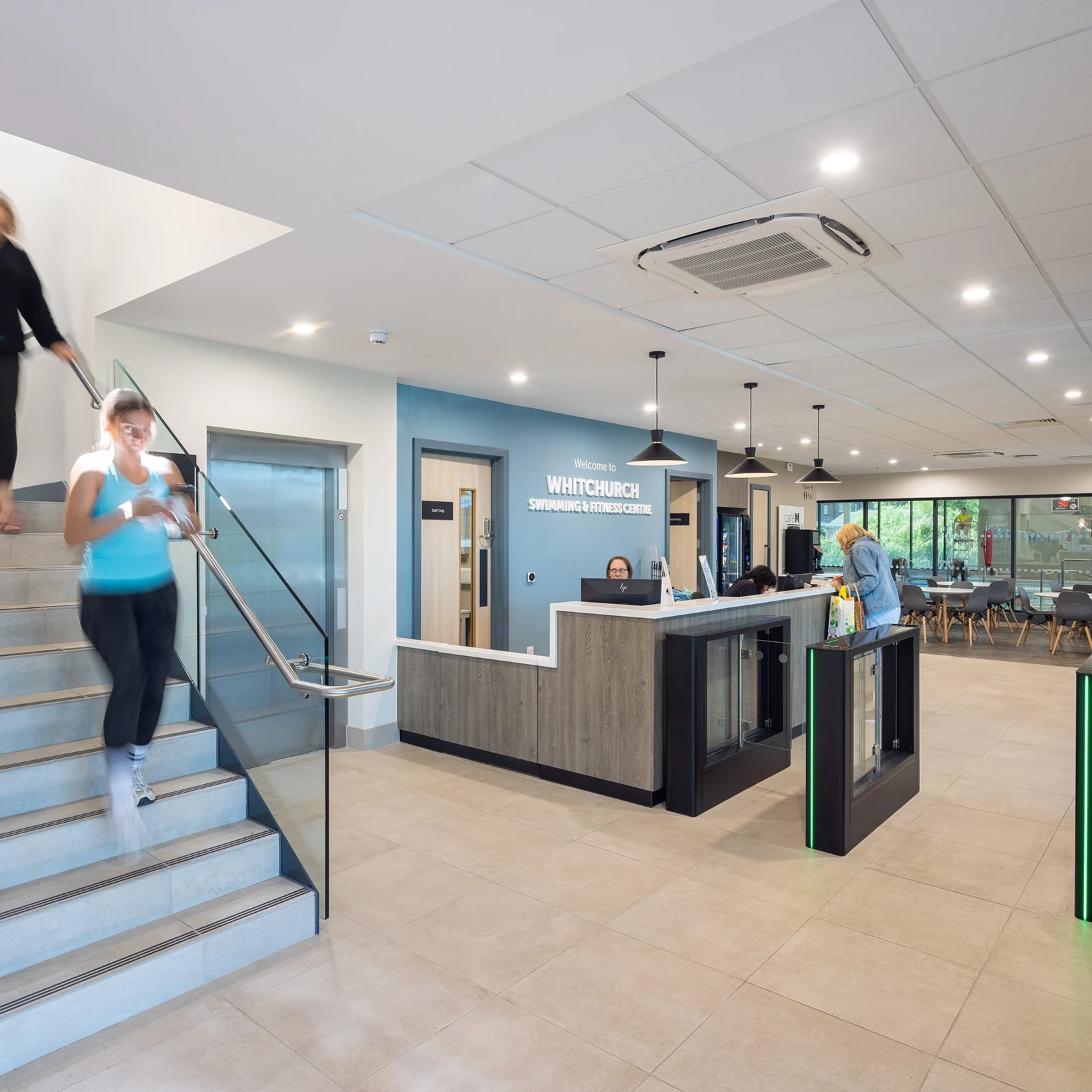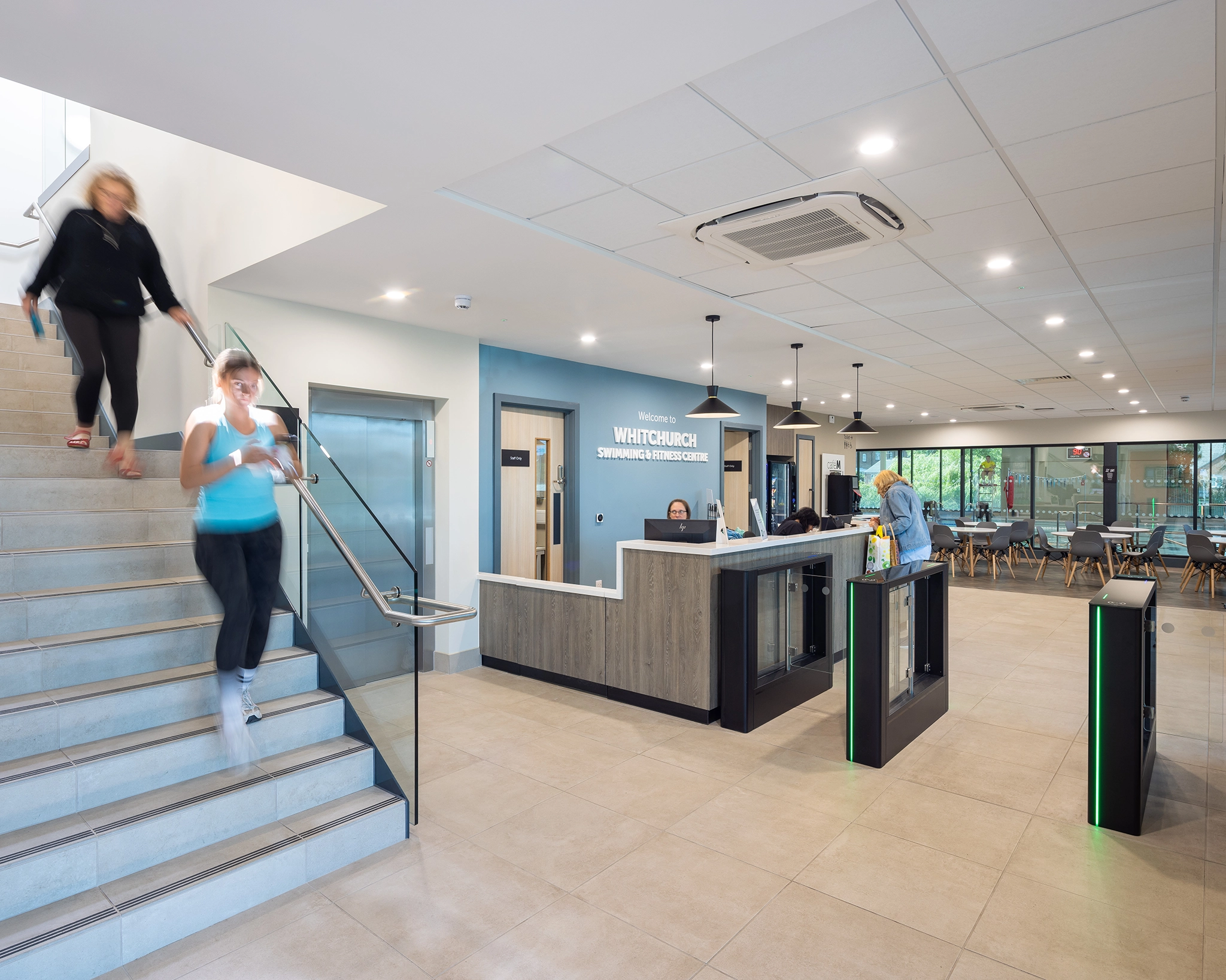 The new facility includes a six-lane, 25-metre pool, a 41-station gym, two fitness studios, and a 20-cover café, all built in line with Sport England’s design guidance. The ground floor houses the pool, café, and changing village, while the upper floor features the gym and flexible studio space.